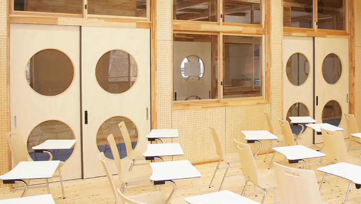 木製間仕切のパイオニアで2017年に三和グループ入りした三和システムウォールでは、地元産の木材を使用した木製間仕切を生産・販売することで、地域から愛される校舎づくりと地域林業の活性化に貢献しています。近年、学習環境の改善、地域とのコミュニティ形成や環境保全を目的として、学校施設に地元の木材を使用した木製間仕切を採用するケースが増えてきています。