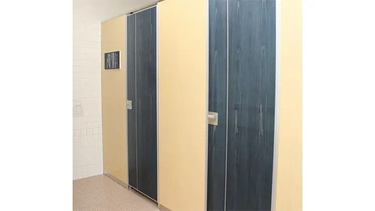 また、2017年、三和シヤッター工業では、徳島すぎに藍染を施した扉を組み込んだトイレブース7ブースを徳島県に寄贈しました。このトイレブースは、徳島県の伝統産業である"藍染"を木材に施す技術を持つ地元企業との共同開発で生まれたもので、徳島すぎの美しい木目と深みのある藍色は落ち着いた雰囲気を演出し、表面のクリアー塗装によって耐水性や耐久性を高めています。
