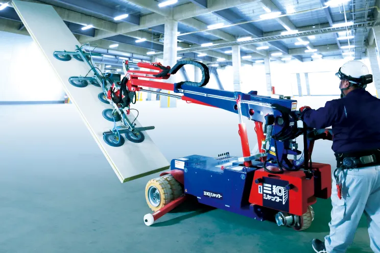 施工の省力化にも注力しており、重量シャッターのシャフトとスラットを工場であらかじめ組み立ててから搬入する「シャッター一体工法」や、溶接を使わずにドアを取り付ける「火無し工法」、電装品のコネクタ化などを推進しています。三和シヤッター工業が2019年11月に発売した「マジカルタイカプラス」は、工場や倉庫などに設置する耐火構造間仕切壁で、従来品のパネル構造や意匠を見直し、「はめ込み式パネル構造」を採用、さらに施工支援ロボットを使用して取付を行うことで、従来の工法と比較して2倍以上のスピードで施工が可能になり、生産性の向上とともに、高齢化の進む施工現場における安全性の向上にも寄与します。