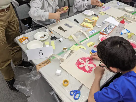 The art classes have taught the children participating in Kidsdoor learning classes how to make Halloween and Christmas wreaths as well as paper mâché masks, with the support of employees from the Design Section of Sanwa Tajima Corporation. This initiative was awarded the Startup Encouragement Award at the 4th Corporate Volunteer Awards in February 2019. In FY 2024, we held an event titled "Let's Make Eco Bags with Original Stamps", where participants painted eco bags using their own handmade stamp designs. A total of 14 elementary and junior high school students, both boys and girls, took part in the activity.