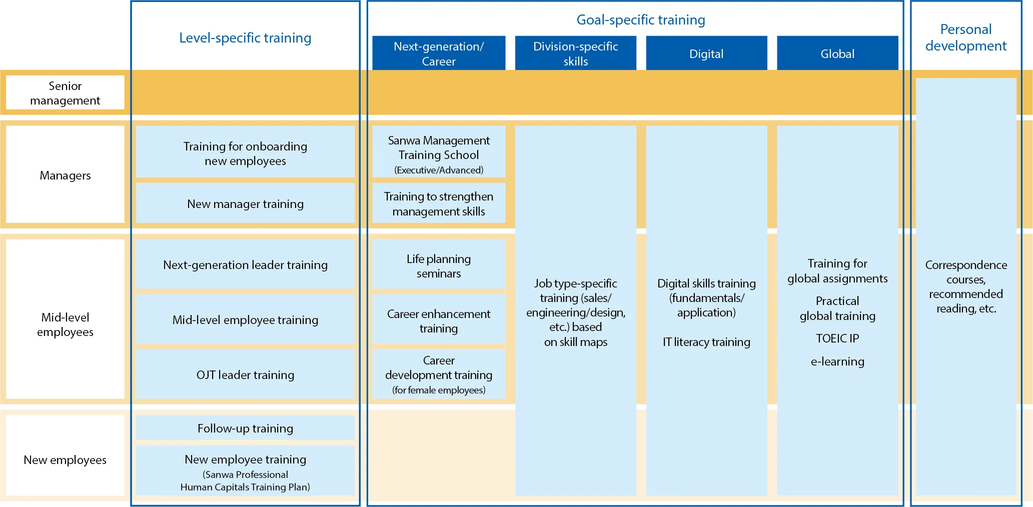 Since fiscal year 2002, the Sanwa Group has been offering its original leadership development program, the Sanwa Management Training School, designed to cultivate leaders who can think from a broad, strategic perspective like top executives. The program consists of two courses: the Advanced Course, targeting section and department managers, and the Executive Course, aimed at future executive candidates.