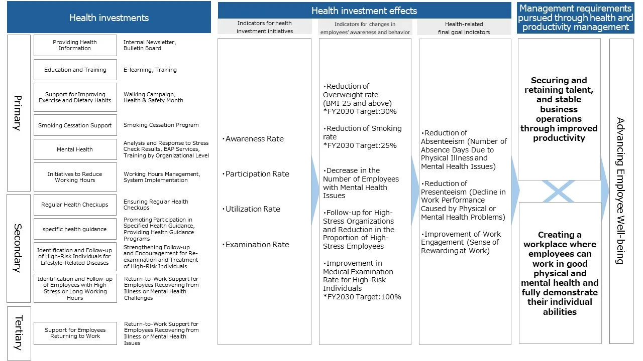 Sanwa Group believes that the continuous ability of employees to work energetically while maintaining both physical and mental health, and delivering their best performance, is essential for the company's growth. In May 2025, we announced our "Medium-term Management Plan 2027" which includes "Creating safe and healthy workplace and promoting wellbeing" as one of the key pillars of the Sanwa Group Human capital strategies, positioning health management as a critical priority. By continuously implementing various initiatives, we strive to create an environment where every employee can work with peace of mind, maintaining sound physical and mental health.