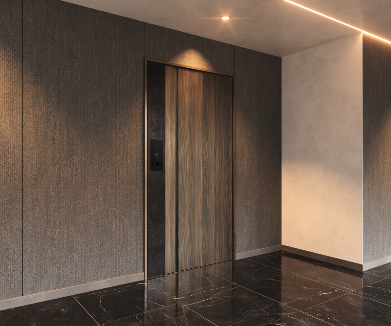 戸先たて枠内、袖パネルに電気錠システムを格納し、シンプル美を追求したハンドルレスのフラットなデザインが高級感を演出します。またドアの表面材は金属調2色、木目調3色の全5色をラインアップ。ドアと袖パネルに異なるカラーを使用することも可能で、様々な空間で最適なカラーを選択いただけます。