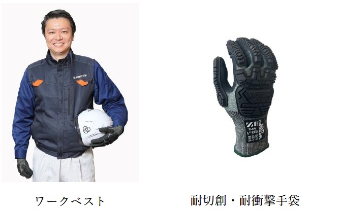 ワークベストは電動ファンを別途搭載可能な仕様で、熱中症対策に有効です。手袋は優れた耐切創性に加えて手の甲側の耐衝撃性を備え、手の平側にはグリップ力と耐摩耗性に優れたニトリルゴムコーティングを採用しています。これらの記念品により、現場の安全性と快適性の向上が期待されます。