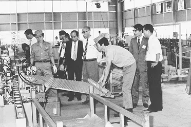 そこで三和は、1958(昭和33)年、大きな技術革新に着手しました。取り付け後に行っていた上塗り作業の手間を省くため、製作段階で焼付塗装ができるコンベアシステムを開発。見積もりの段階で色を選べる仕組みは顧客に歓迎され、「ペンキを塗らなくても良いシャッター」として大きな反響につながりました。さらに、シャッターのカーテン部分を構成するスラットの切断工程を改善。寸法に応じた柔軟な対応が可能となり、生産量は一気に拡大したのです。
